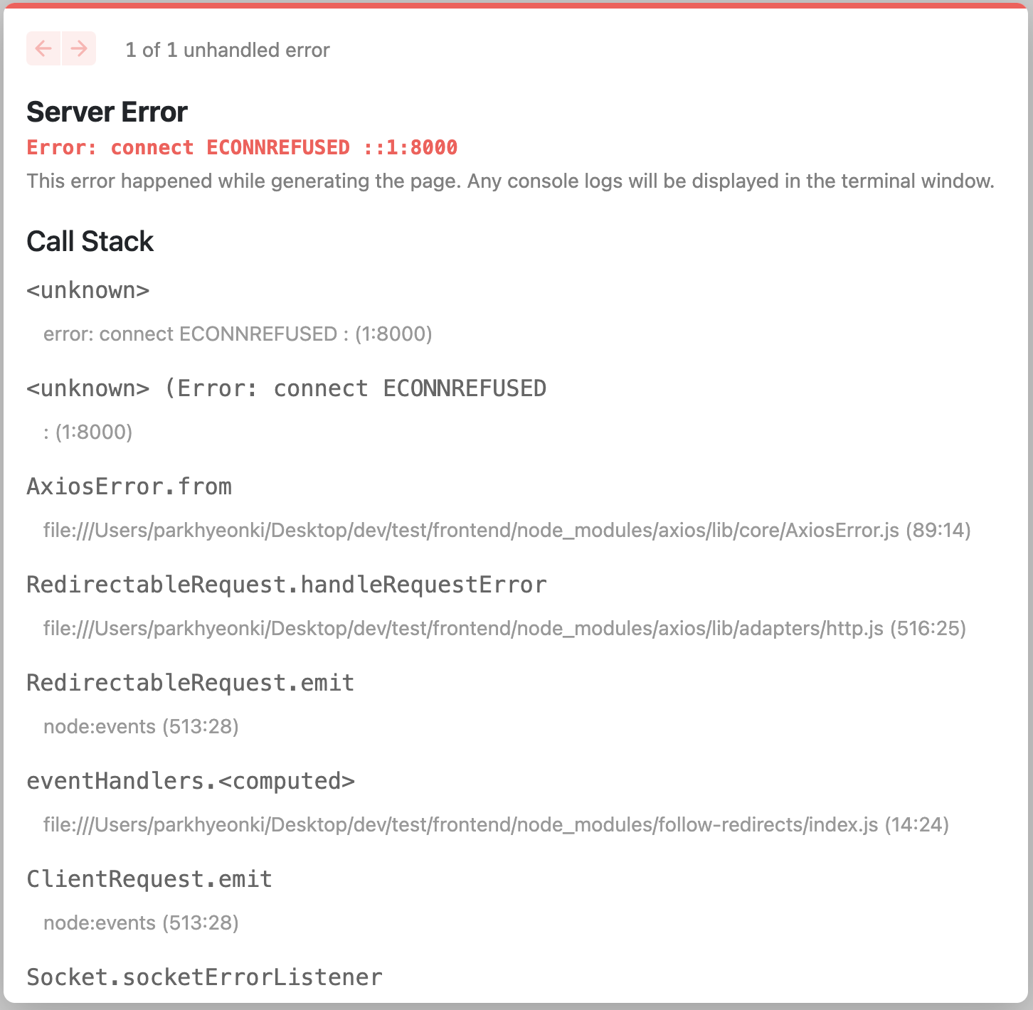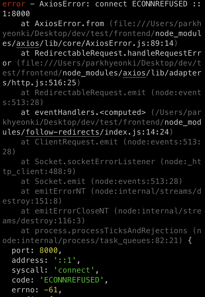- 서버 확인 보통 axios ECNNREFUSED 에러는 통신하려는 서버가 꺼져있을때 많이 발생하는 에러로 확인했다. 하지만, 나의 경우에는 다른 페이지는 정상작동을 하고 있어서 서버가 꺼져있는 상태는 아니였다. console의 에러를 확인해보니 address가 정상적으로 들어가지 않은 것으로 확인되고, 에러도 서버를 확인할 수 없을 때 발생하기 때문에 정상적인 주소로 요청을 보내지 못하고 있다고 생각했다.